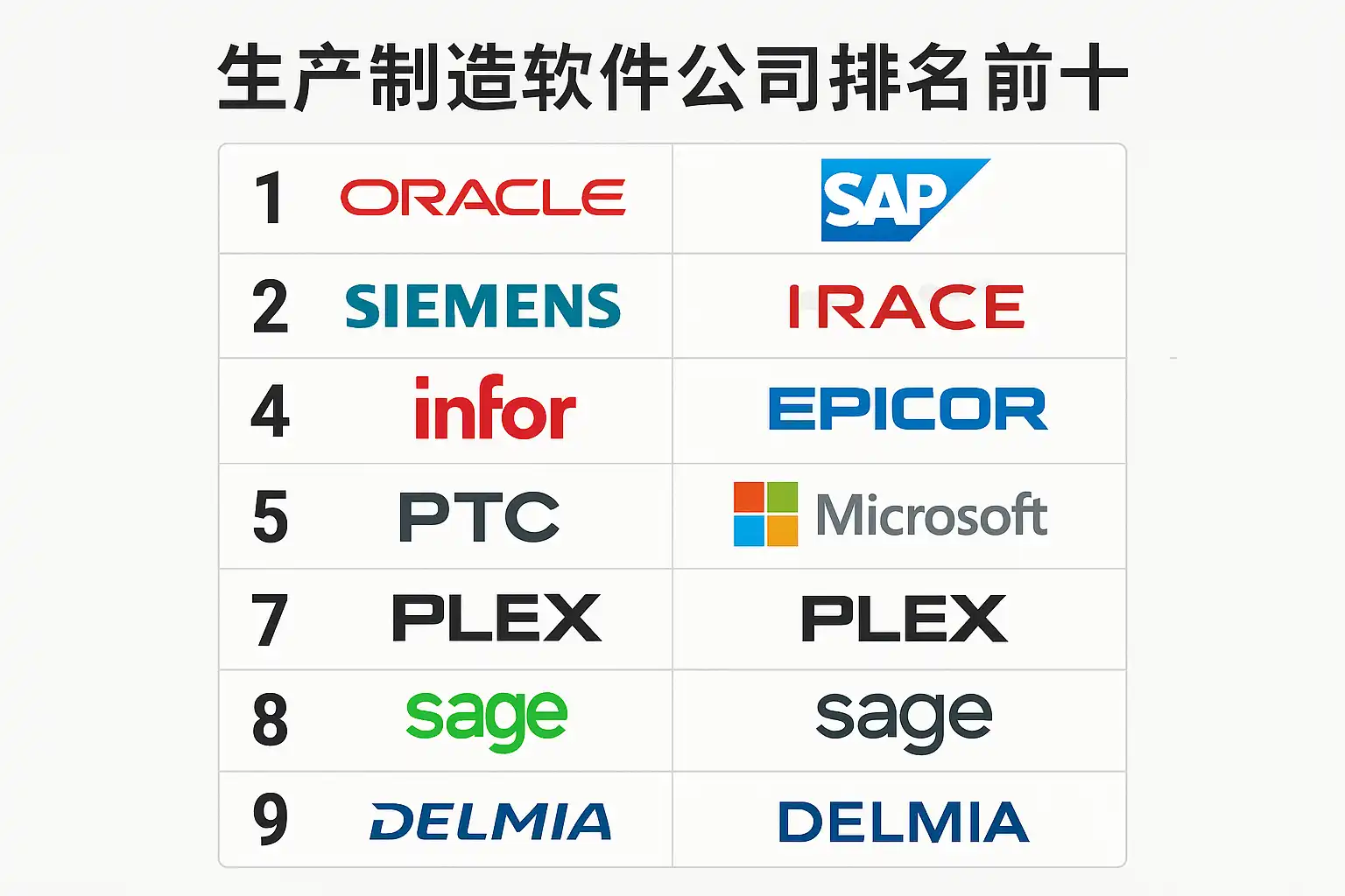| 1 | SAP | SAP S/4HANA | 中大型企业 | ERP+MES一体化,全球化支持 |