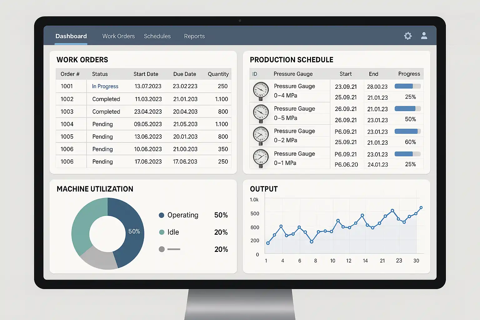 压力表生产加工涉及多道工序,从订单接收、设计、备料、生产、装配到检验、发货,每一步都需要精准协同。常见核心痛点包括: