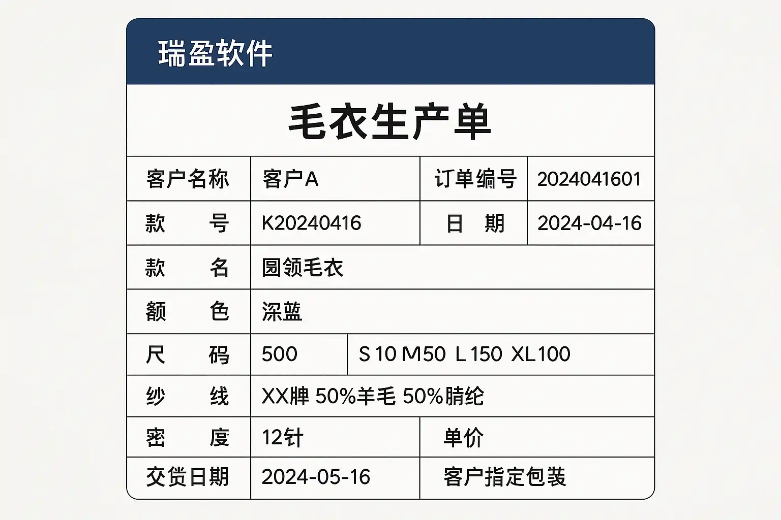 瑞盈软件毛衣生产单作为生产管理的核心工具,贯穿从订单下达到生产执行的全过程。其填写流程分为以下几个主要步骤: