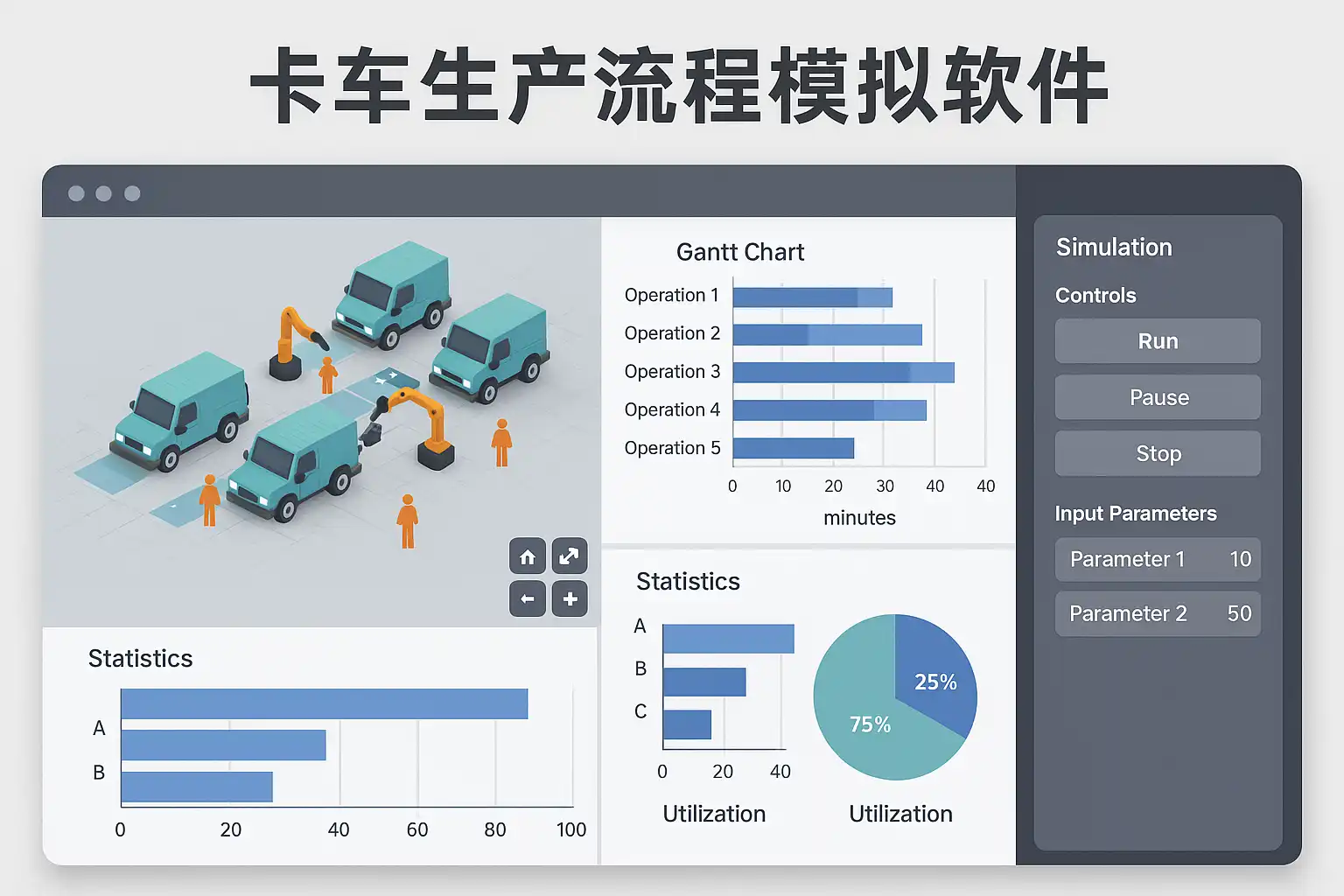 卡车生产流程模拟软件是指通过数字化建模与仿真技术,将卡车生产线上各个环节(如采购、装配、检测、物流等)以虚拟方式展现和优化的软件工具。其核心价值体现在以下几个方面:
