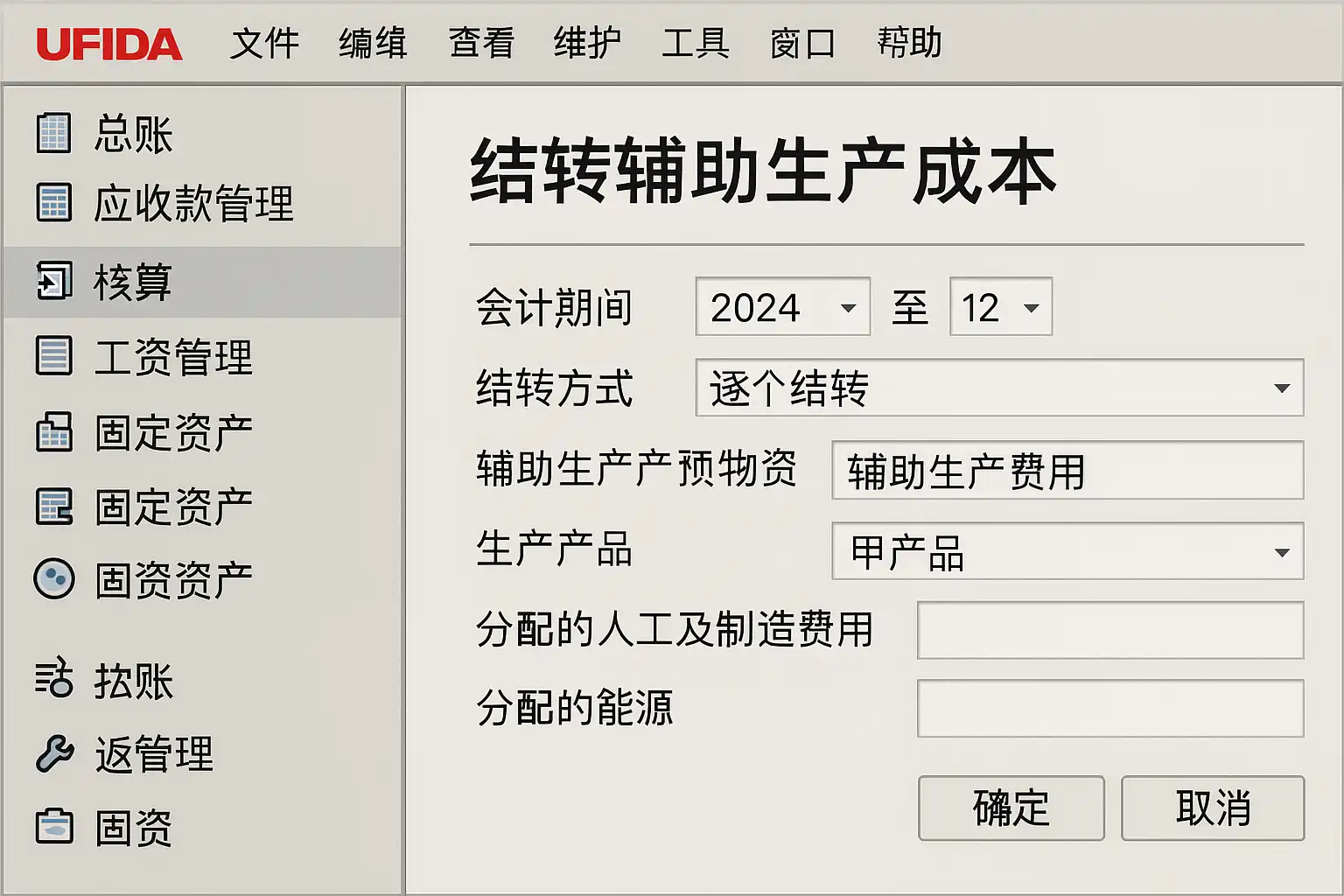 - 成本核算设置:配置辅助生产成本的核算科目和相关参数。