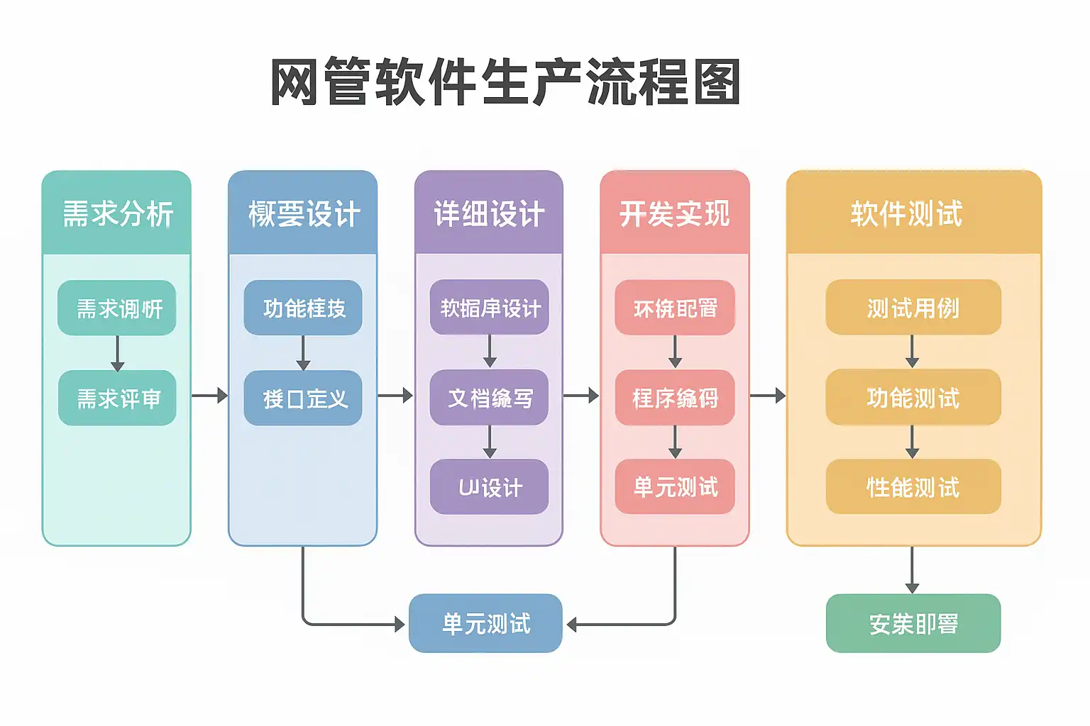 网管软件生产流程图通常涵盖从需求到上线的全周期环节。以下列表为常见核心步骤及说明: