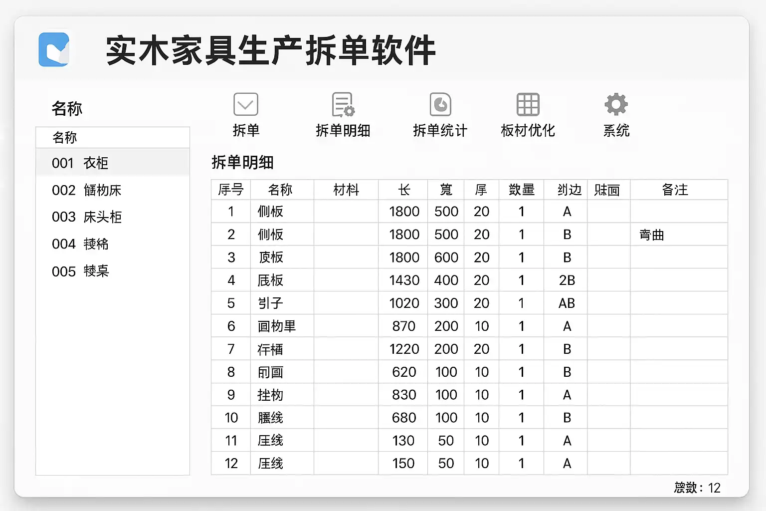 | 物料清单管理 | 全靠经验手工计算 | 软件自动汇总,精确到每个板材配件 |