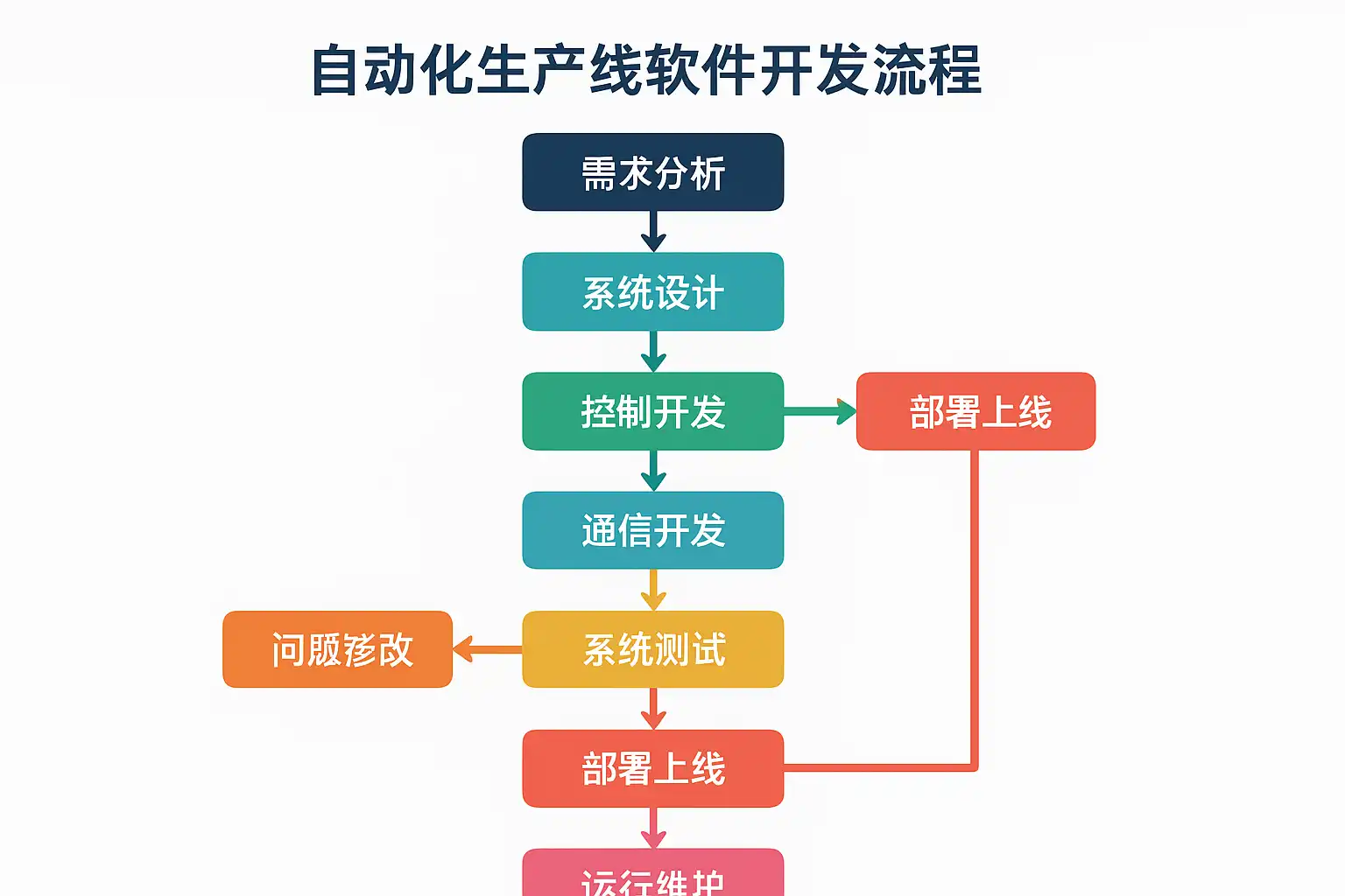 自动化生产线软件开发主要包括需求分析、系统设计、编码实现、测试验证和部署维护五大流程。具体步骤如下: