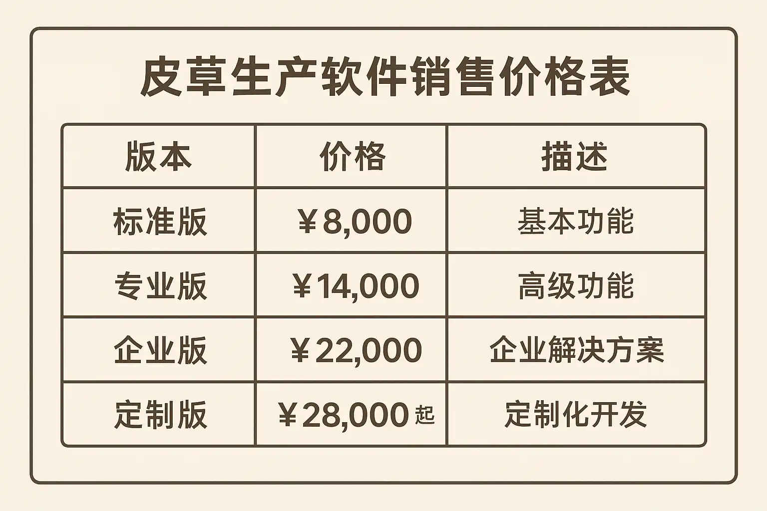 例如,某知名品牌的标准版软件报价为18,000元,支持皮草生产全流程管理,适合中小型企业。
