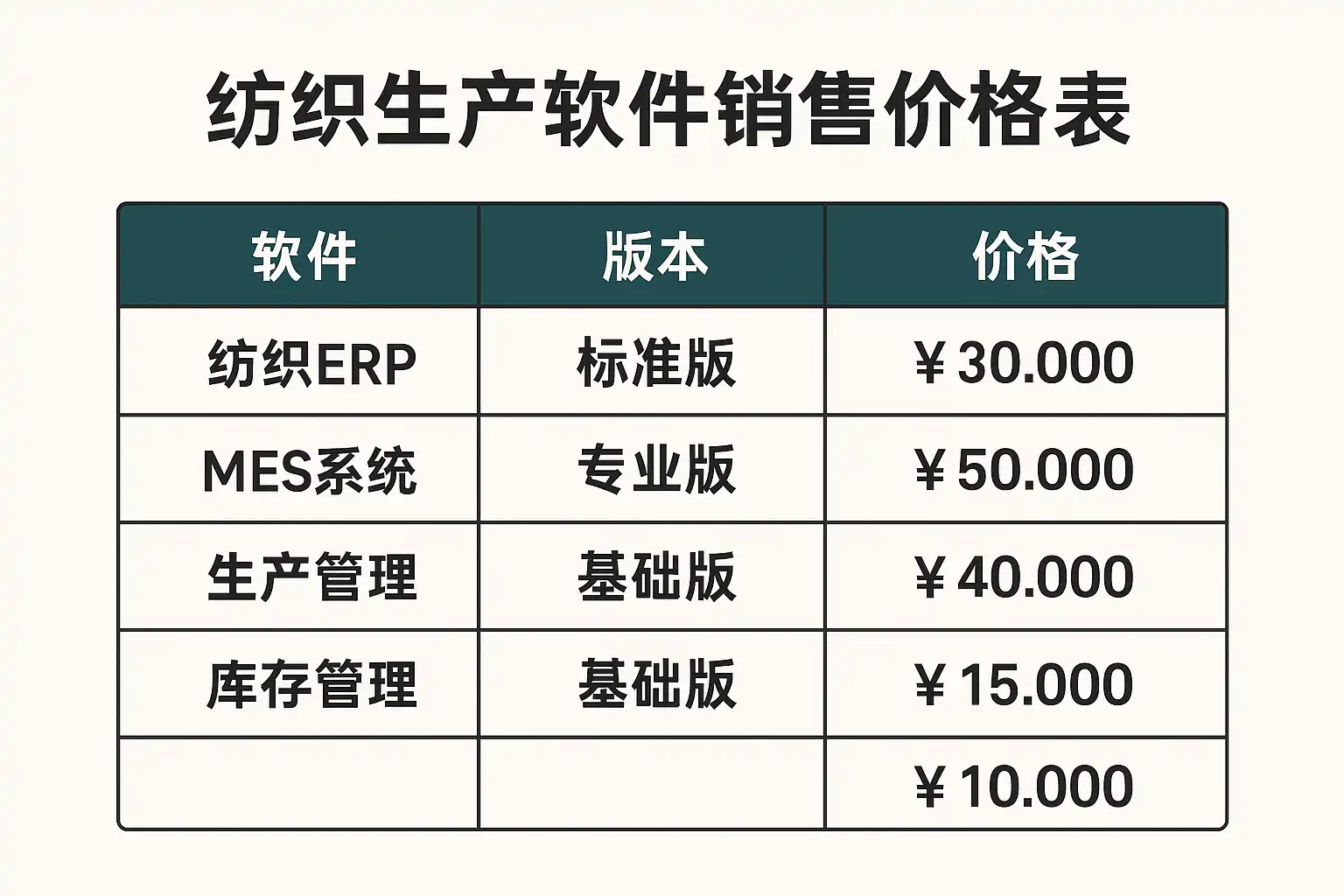 以下为市场上部分主流纺织生产管理软件的价格对比,供企业参考: