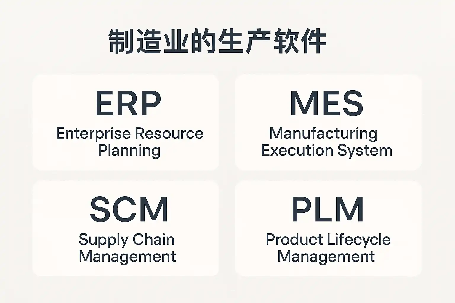 | MES | 生产过程控制 | 车间调度、生产追溯、实时数据采集、工单管理 | 生产车间、现场管理 |