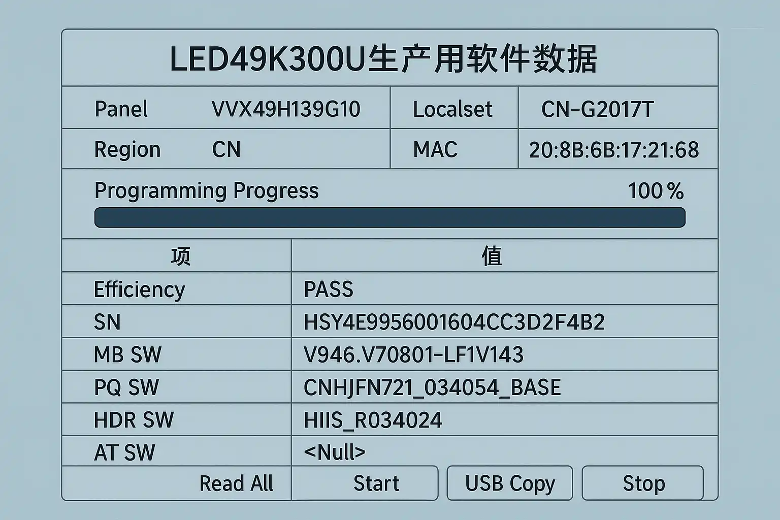LED49K300U生产用软件数据,主要指在生产、组装、测试和质检环节用于支持电视功能、性能调试与验证的各种固件、驱动程序及生产测试工具。其分类如下: