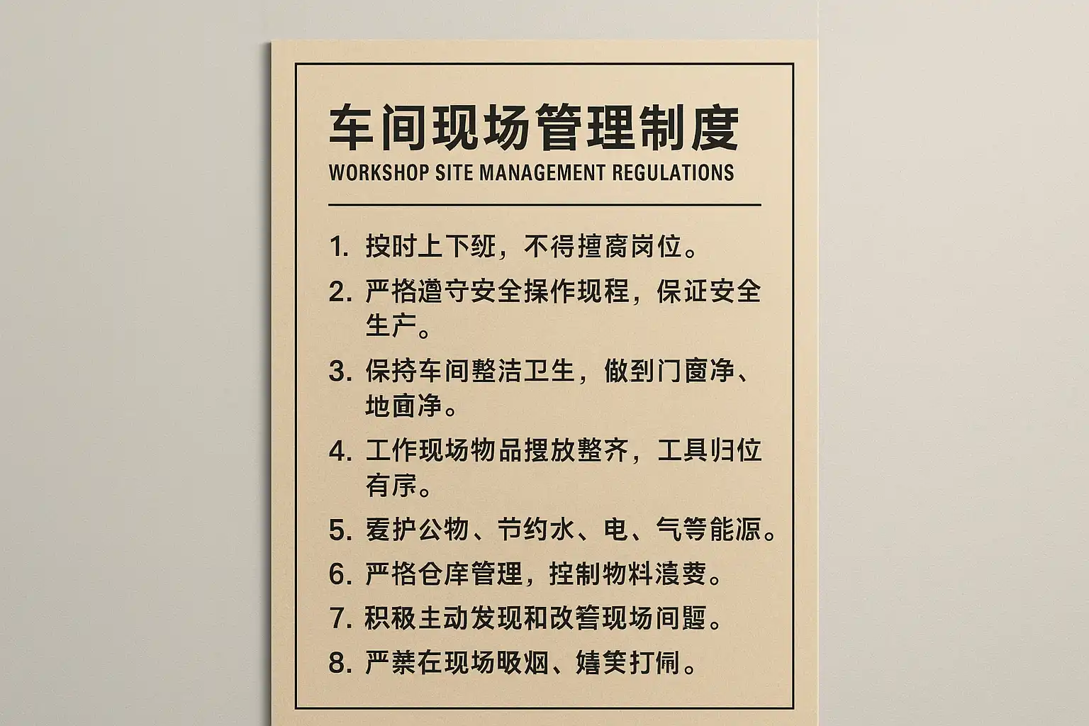 - 结合标准:参考行业最佳实践和国家安全法规,结合车间实际情况定制管理条款。
