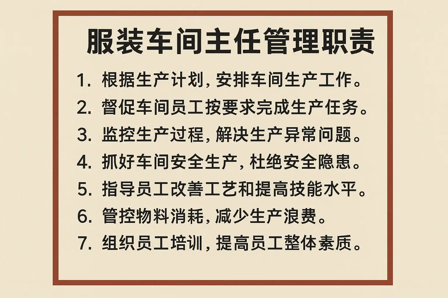 服装车间主任的岗位涵盖了生产、人员、质量、设备与安全等多个方面,其职责体系如下: