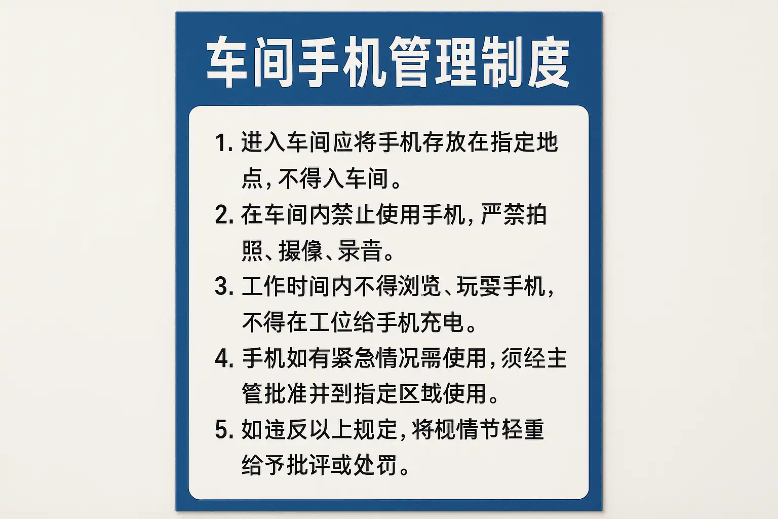 - 制定明确的手机使用时间和区域(例如,休息区允许使用,生产区禁止使用);