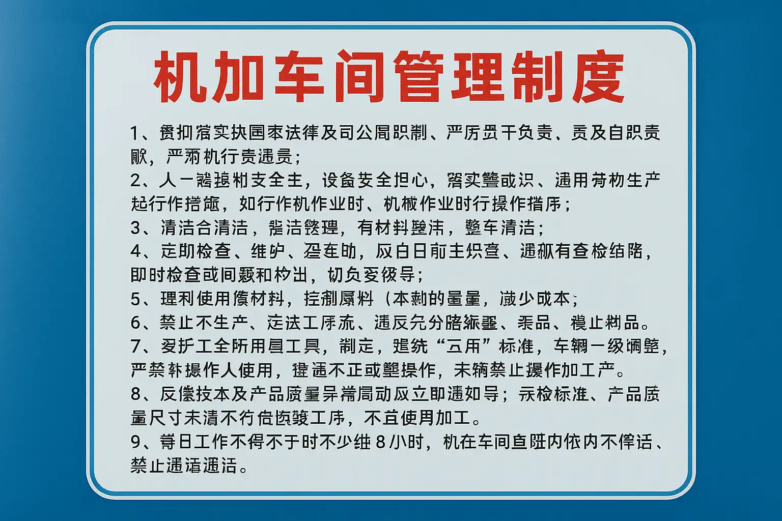 机加车间管理制度是确保生产秩序、产品质量和员工安全的基础。其核心内容通常包括以下几个方面: