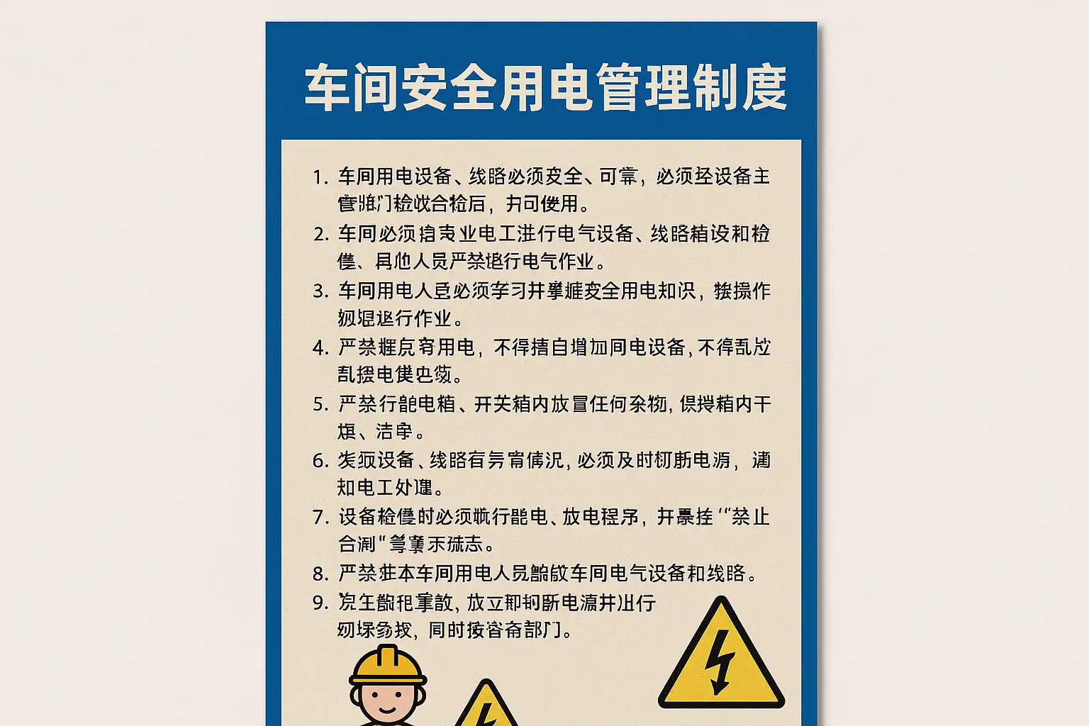 - 制度内容与核心要求 完善的用电管理制度是车间安全的基石,应涵盖以下方面: