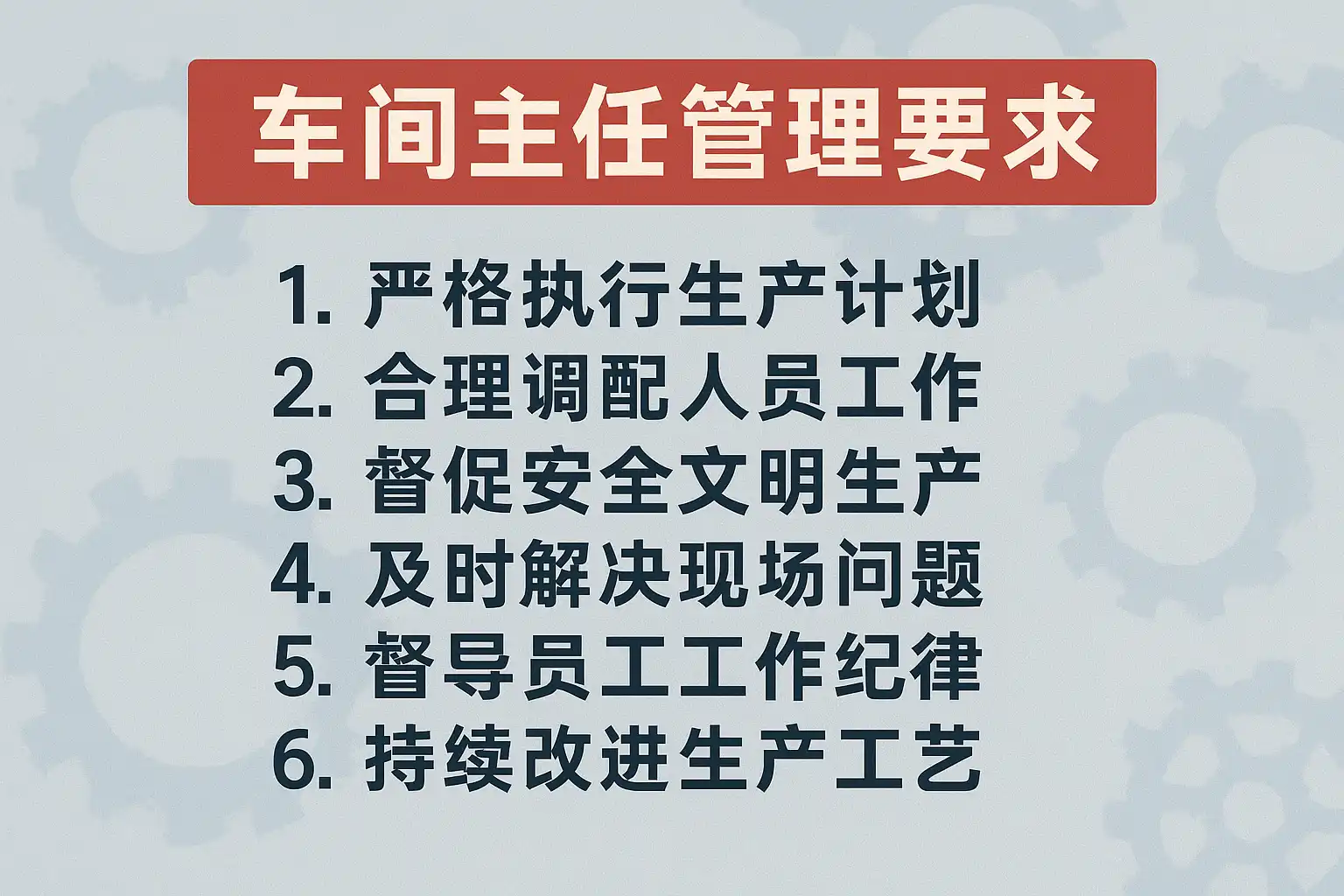 这些要求共同构成车间主任工作的核心框架,决定着管理水平和生产效能。