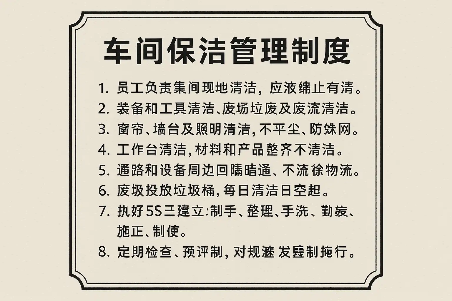 效果:在制度、工具、团队三位一体的保障下,车间的清洁效率提升了30%以上,卫生投诉下降85%,员工参与意识明显增强。