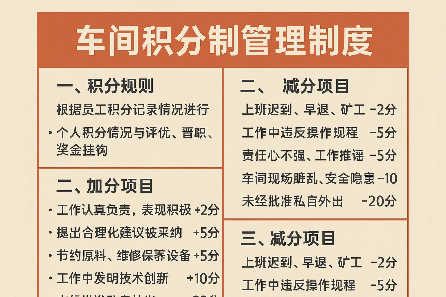 - 积分规则动态调整,结合生产实际与员工反馈。