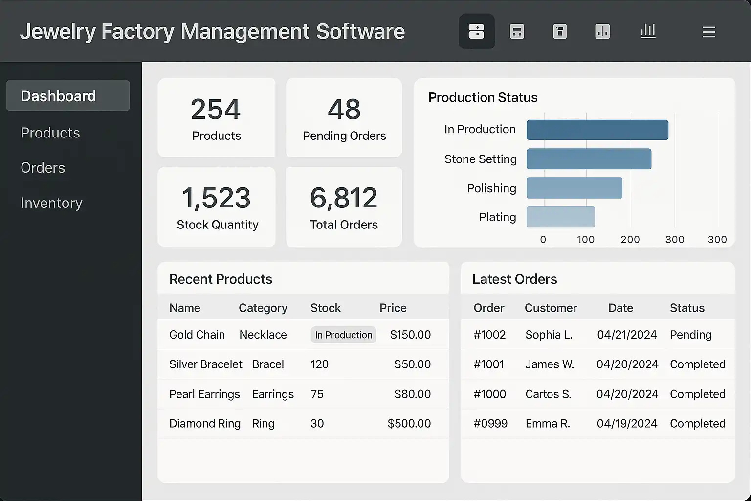 - 生产数据可视化仪表盘,帮助管理者了解各工序状态,优化调度。