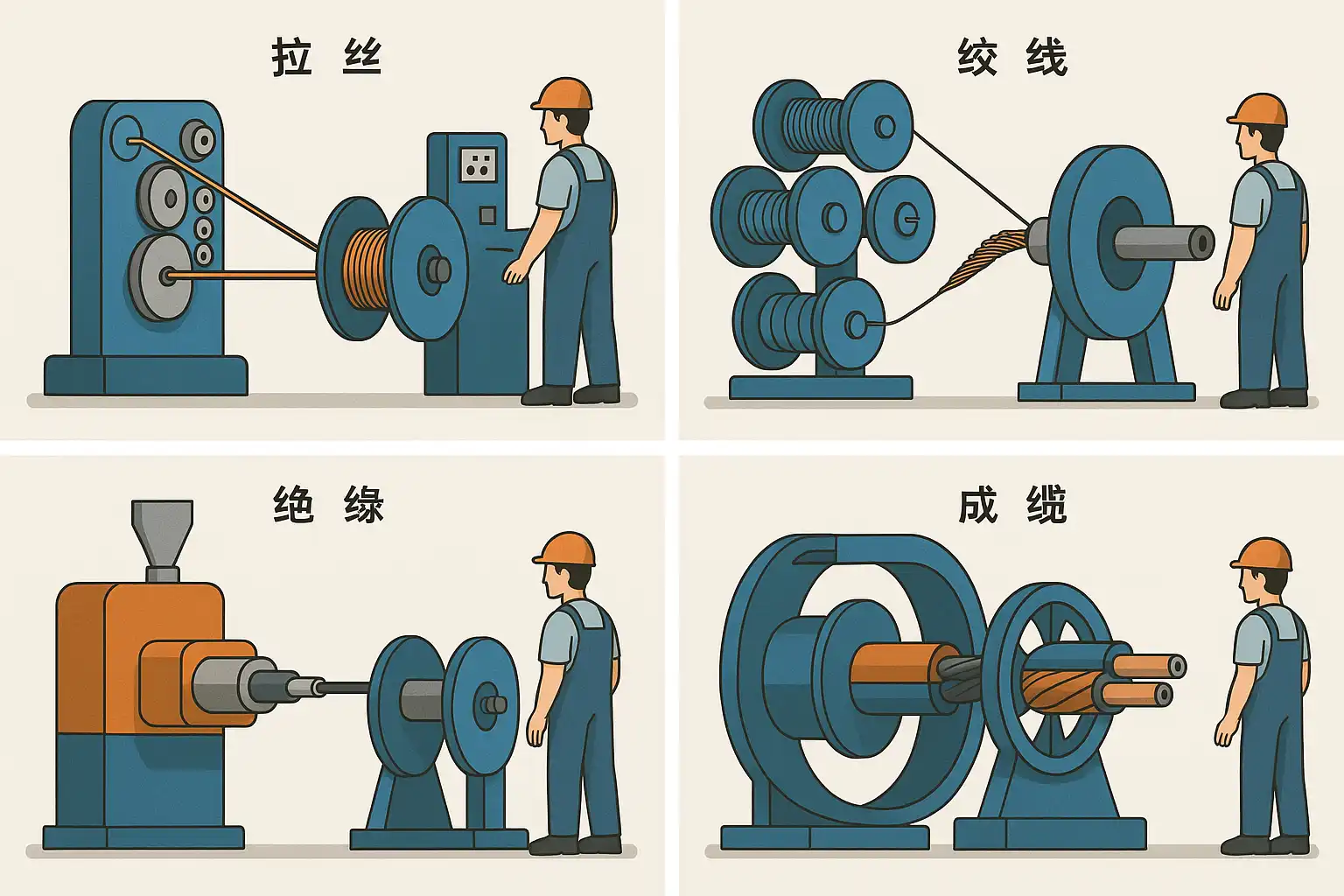 电缆生产工序主要包括拉丝、绞线、绝缘挤出、成缆、护套、检测与包装等环节,每个工序对质量和效率的影响都非常关键。