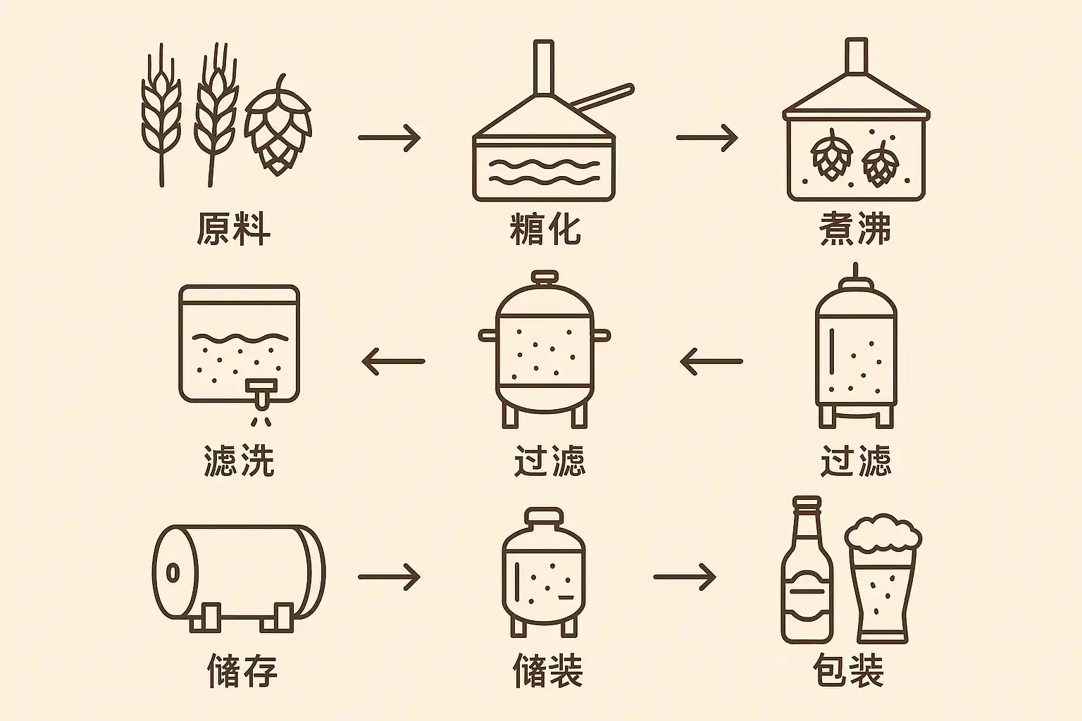 - 熟成(Maturation):啤酒在低温下存放数周,风味更加醇厚。