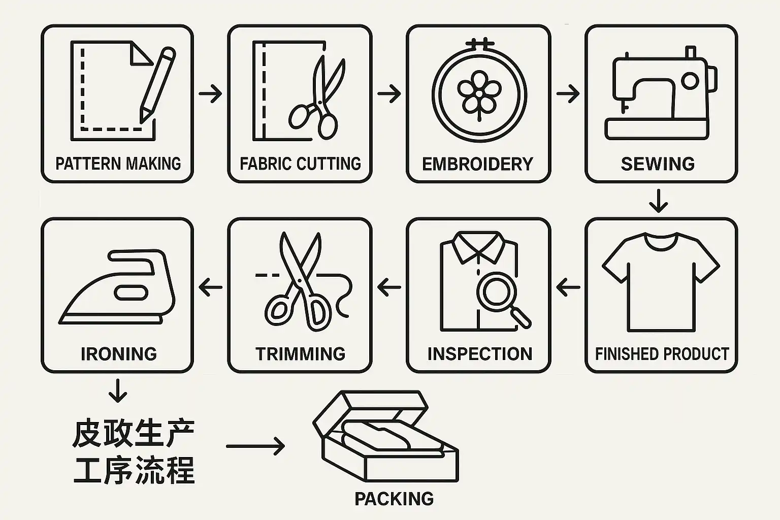 - 质检包装:严格检测服装质量,完成包装出货。