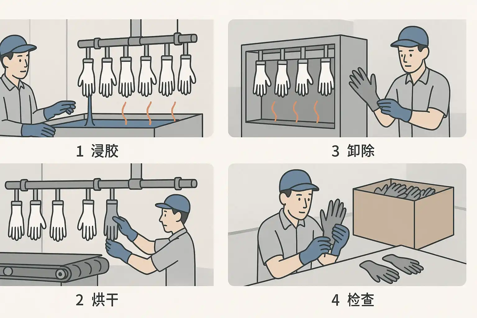 | 7 | 清洗烘干 | 用水或化学剂清洗残留物,烘干确保手套洁净 |