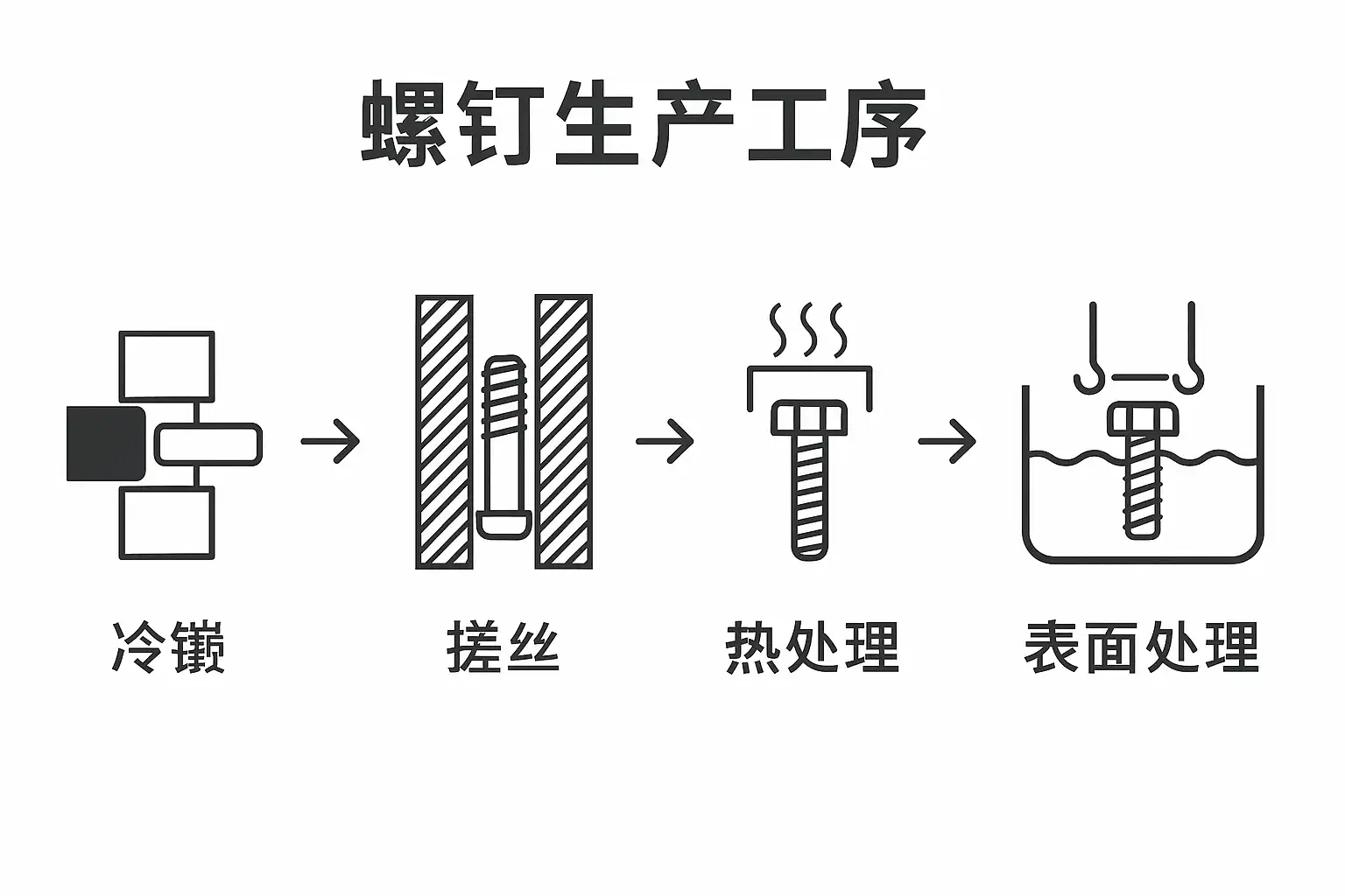 通过结构化的工序衔接,能够保证螺钉的尺寸精度和性能稳定,提升整体生产效率和产品质量。