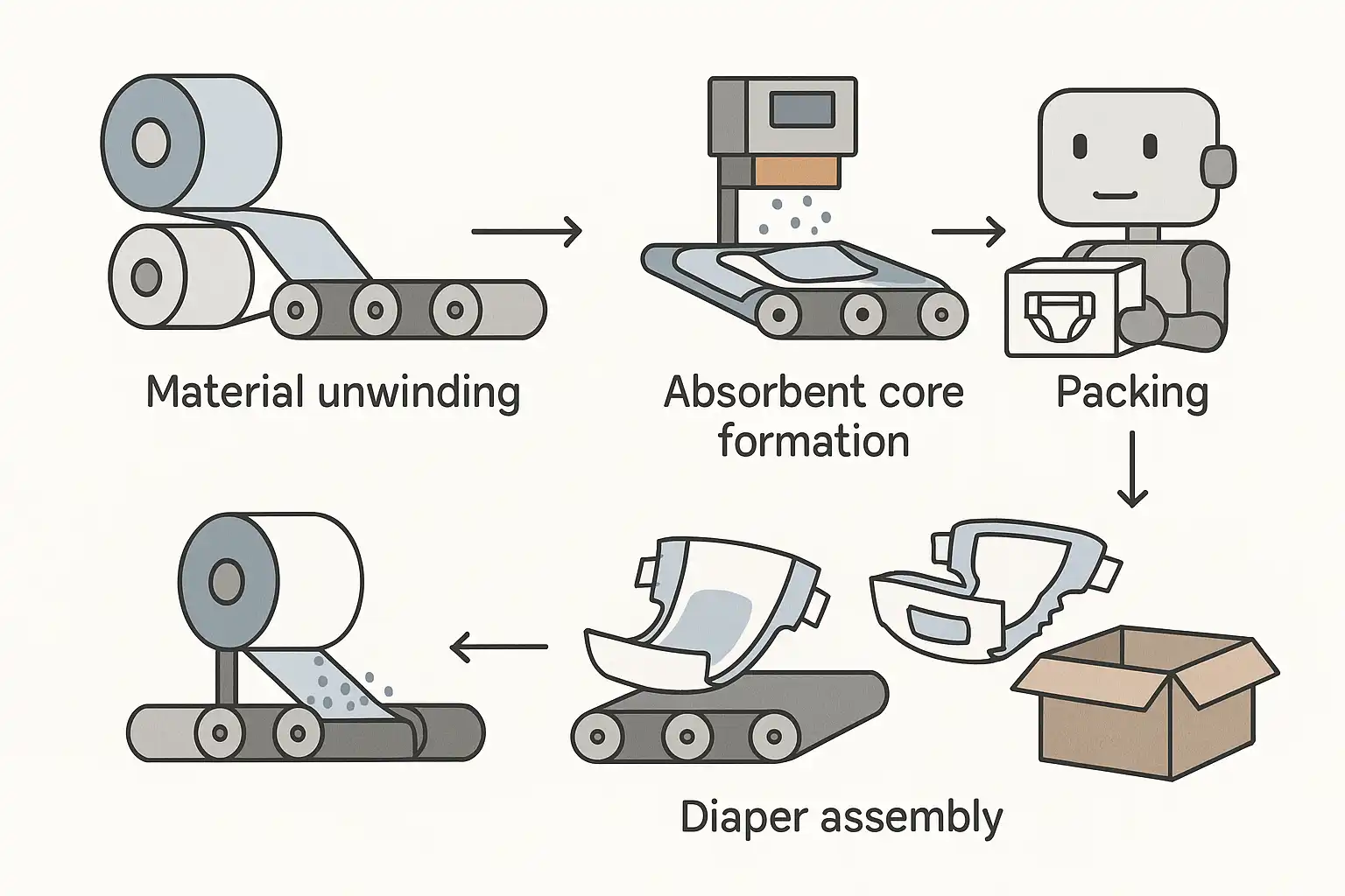 作为新手,我对纸尿裤的生产流程不是很清楚,听说有很多关键步骤,具体都包括哪些?这些步骤在生产中起到什么作用?