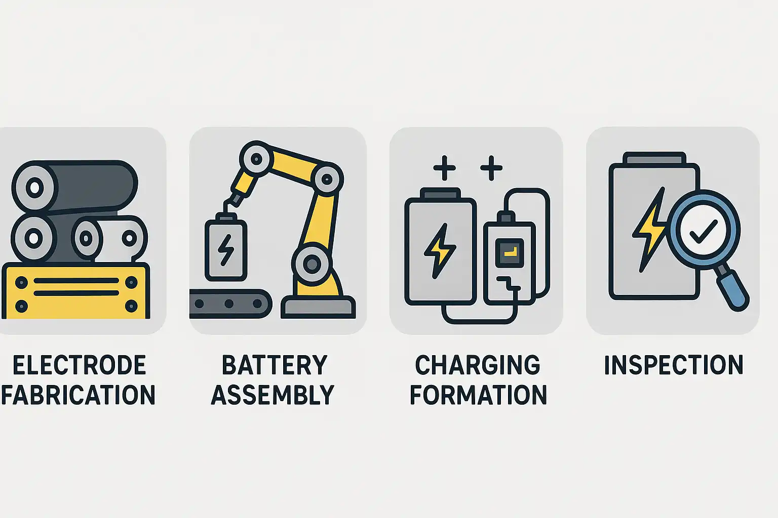 - 电极制造:通过涂布、干燥和辊压工艺形成电极片。