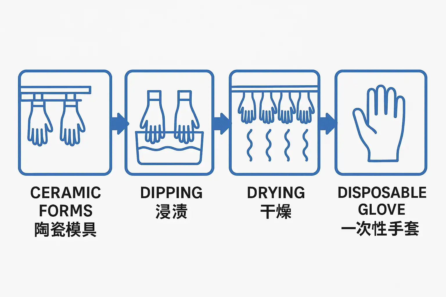 | 浸胶成型 | 模具浸入胶液,形成手套雏形 | 浸胶时间、温度控制 |