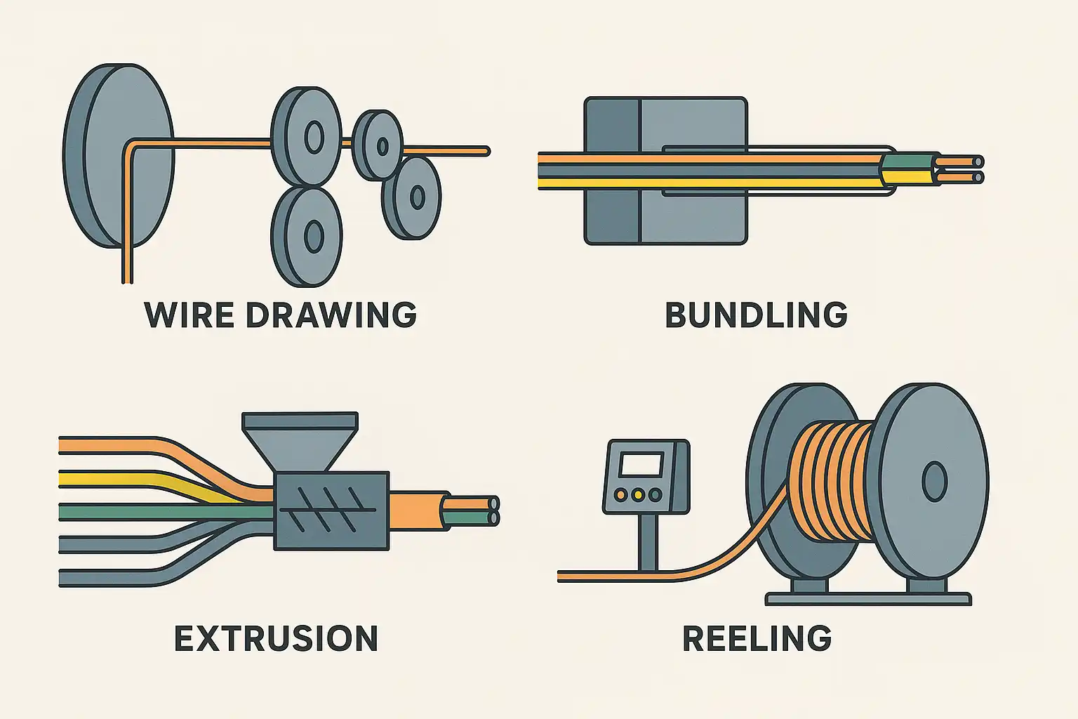 线缆生产是一项复杂且要求高度精密的工业过程,涉及多道工序和环环相扣的质量控制点。以下为典型的线缆生产流程: