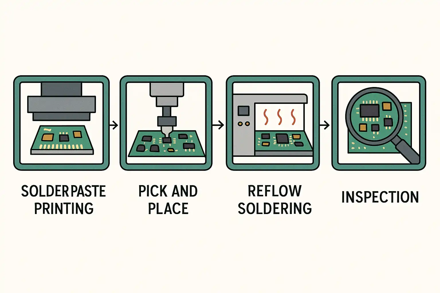 - 焊接工序:包括回流焊和波峰焊,保证焊点牢固,避免虚焊。