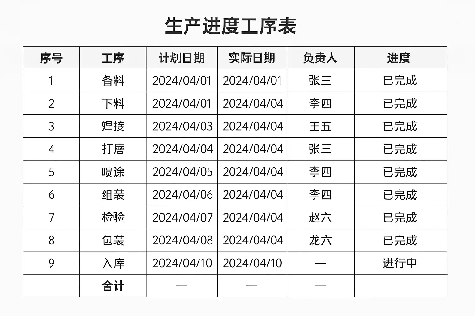 - 生产进度工序表格将与MES、ERP等系统深度融合,实现全厂生产数据自动流转和智能调度。