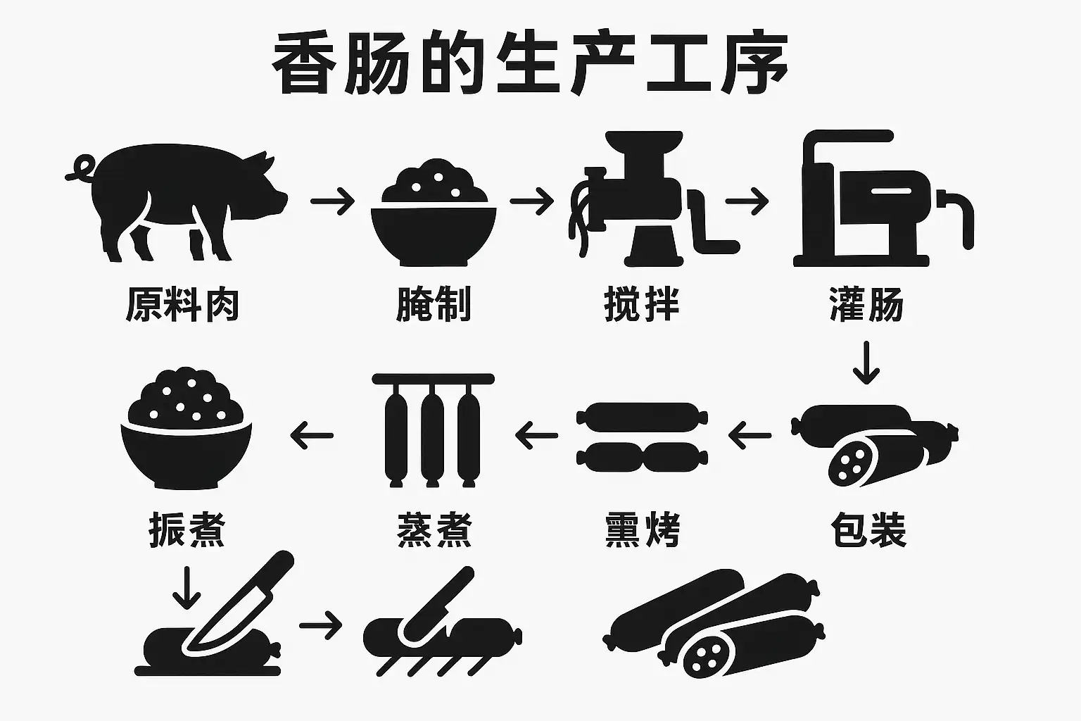 我最近对香肠的制作过程很感兴趣,想知道香肠是如何从原材料变成成品的?具体有哪些关键的生产工序呢?