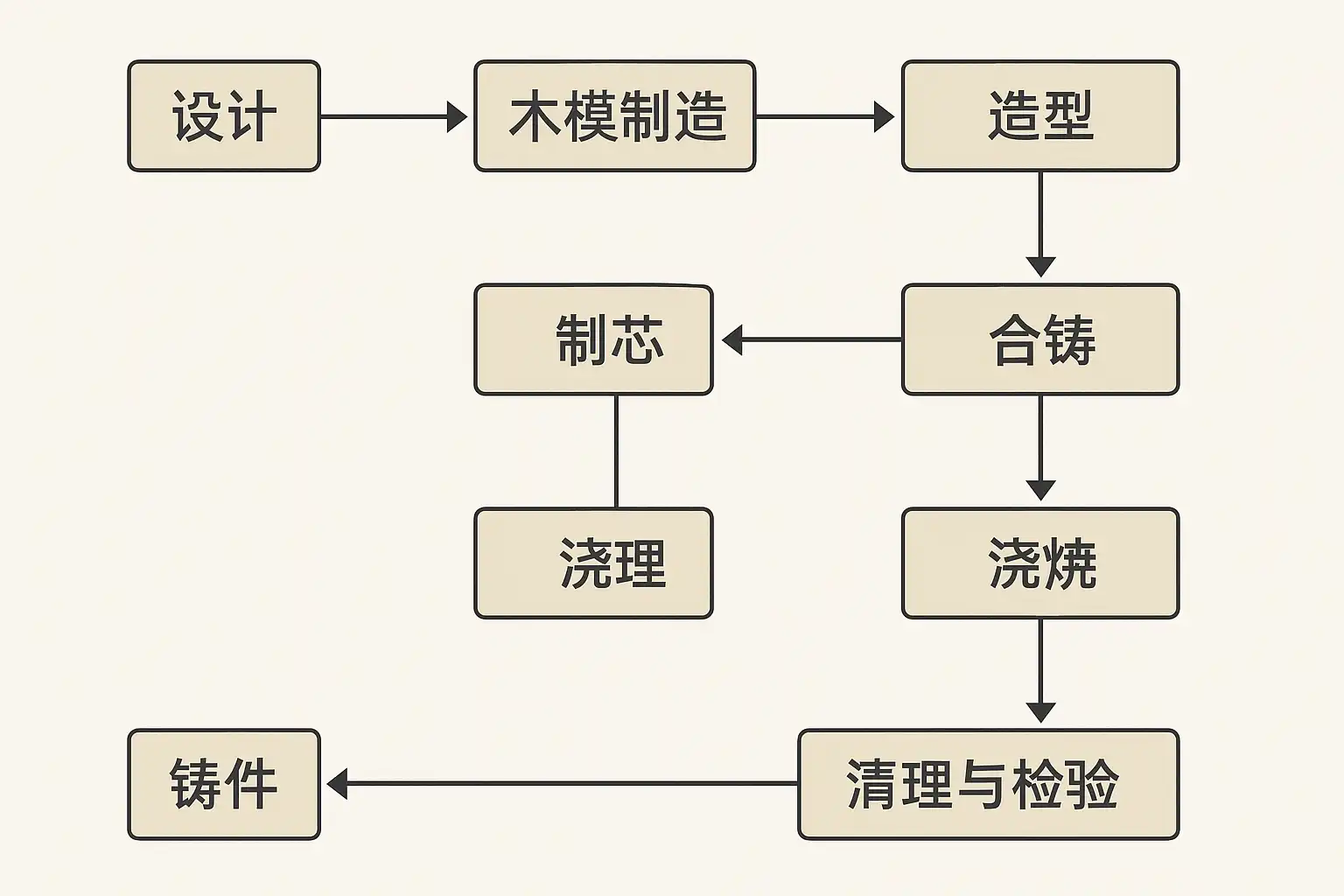 - 工艺设计 → 2. 模具制造 → 3. 造型制芯 → 4. 合金熔炼 → 5. 浇注 → 6. 清理打磨 → 7. 检验修整 → 8. 成品入库