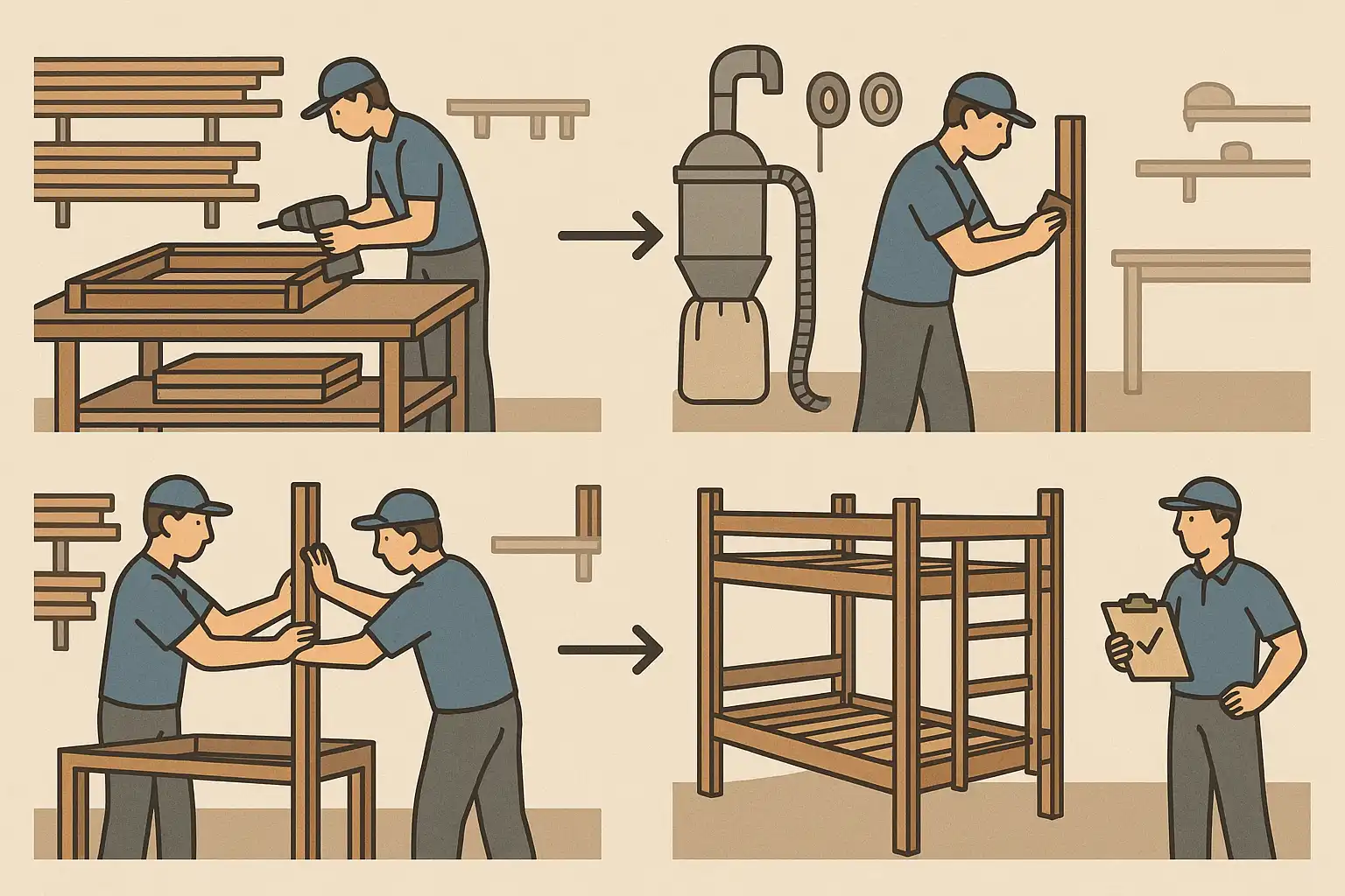 双层床生产涉及多个环节,每一步对成品质量和整体效率都至关重要。标准化的生产流程不仅能减少失误和返工,还能提升员工操作一致性,降低资源浪费。以下为典型的双层床生产工序: