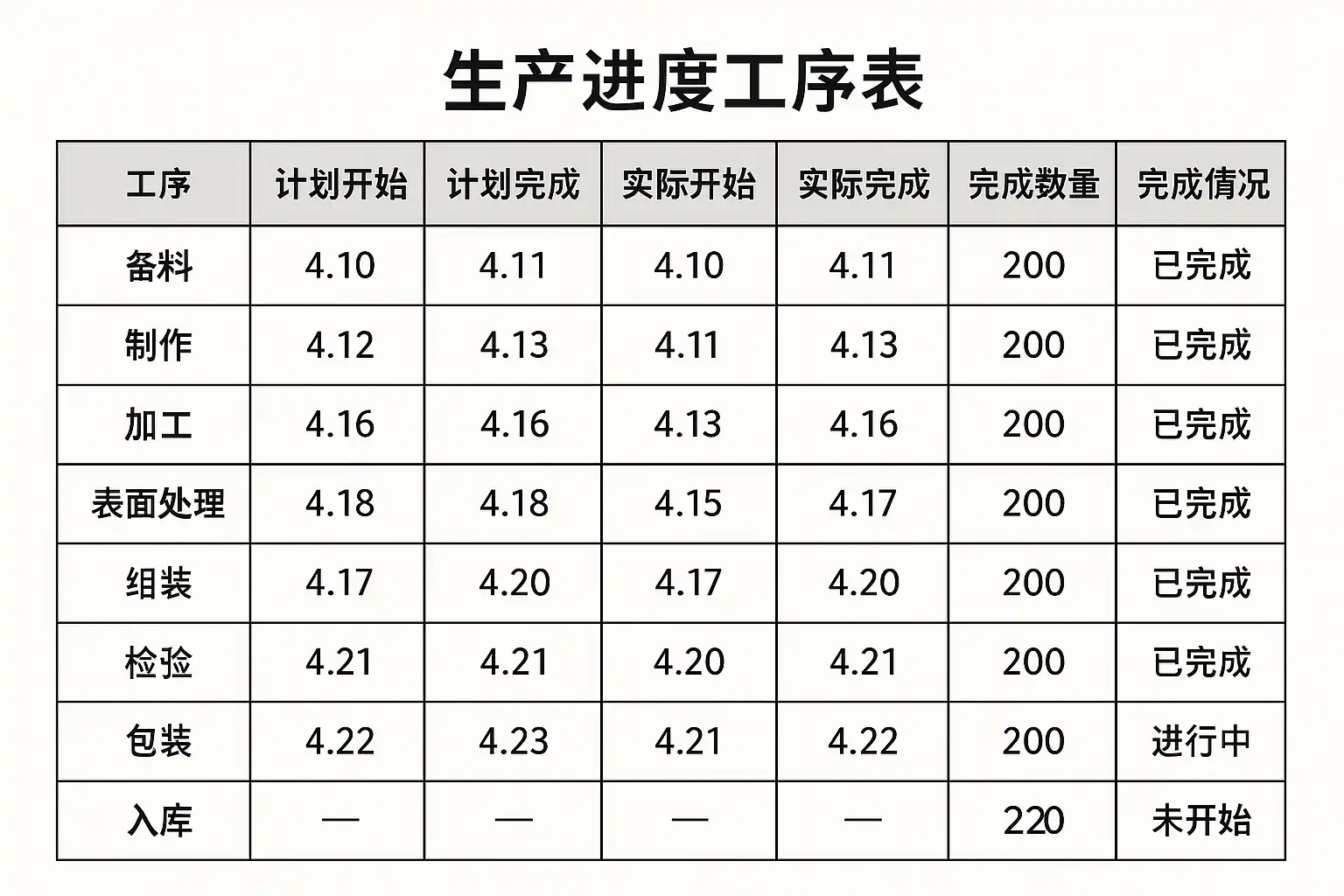 如何通过结构化布局和数据化表达提升生产进度工序表格的可读性?
