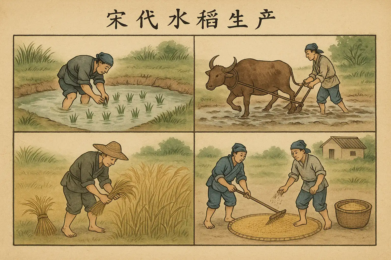 - 人工割稻:宋代主要靠镰刀人工收割,分组作业,效率较高。