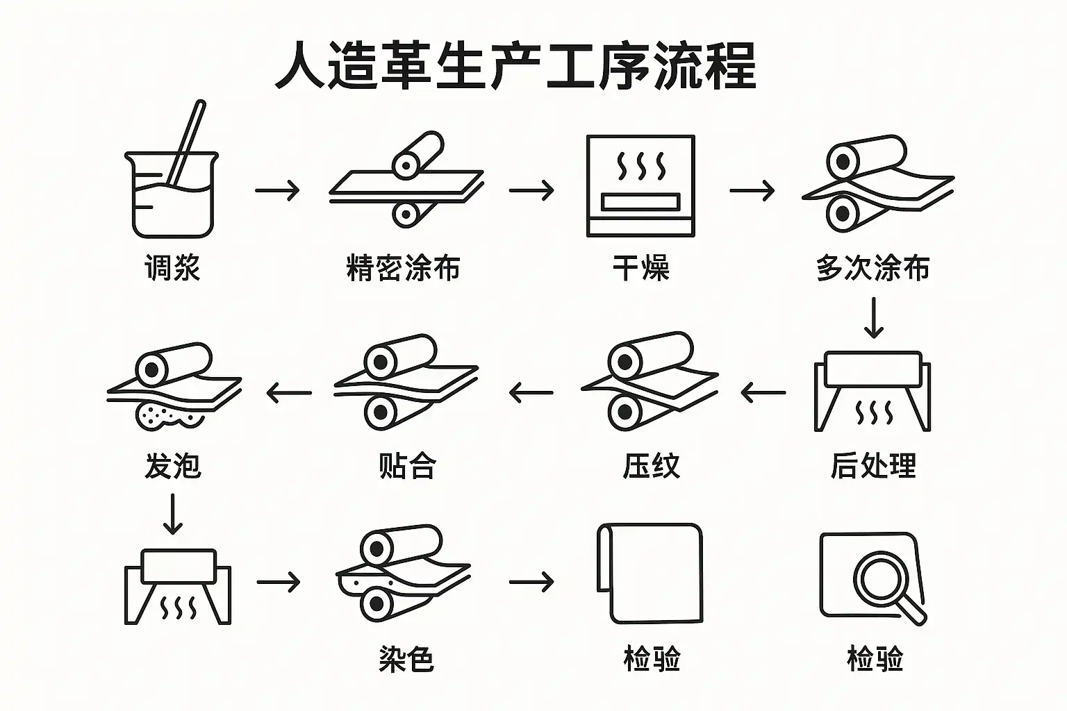 我对人造革的生产流程不是很了解,想知道从原材料到成品具体包含哪些步骤?这些工序中哪些是决定品质的关键环节?