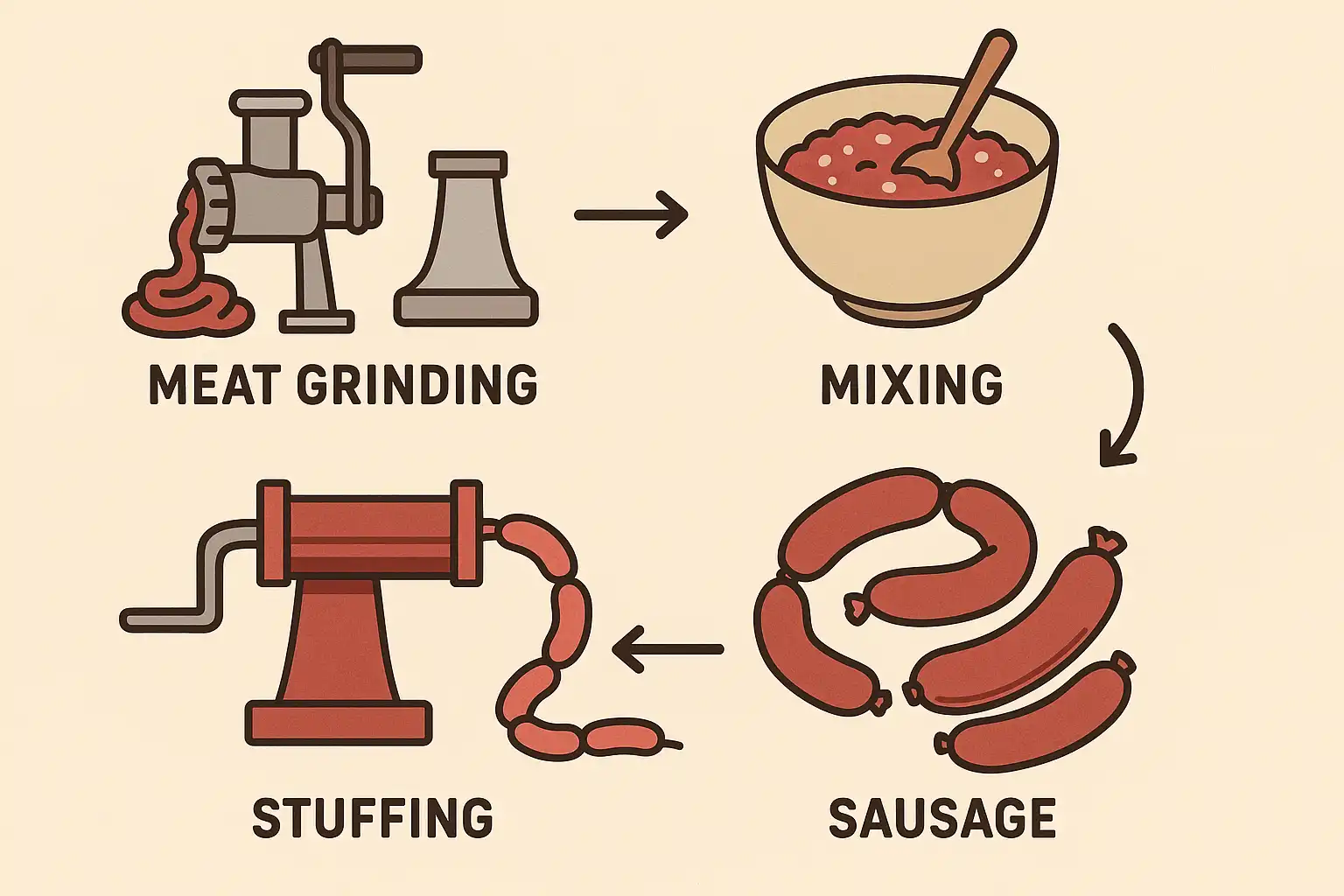 我对香肠的制作流程很感兴趣,想知道从原料到成品,香肠生产工序具体包括哪些步骤?每一步的作用和顺序是怎样的?