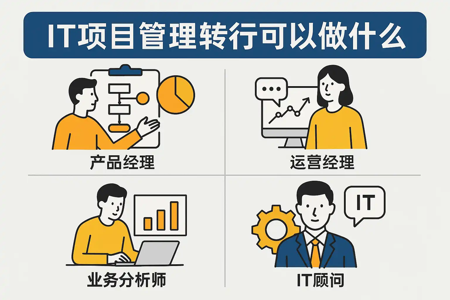 IT项目管理的背景为从业者提供了丰富的组织协调、流程管控、沟通推动等能力。转行时,常见方向包括: