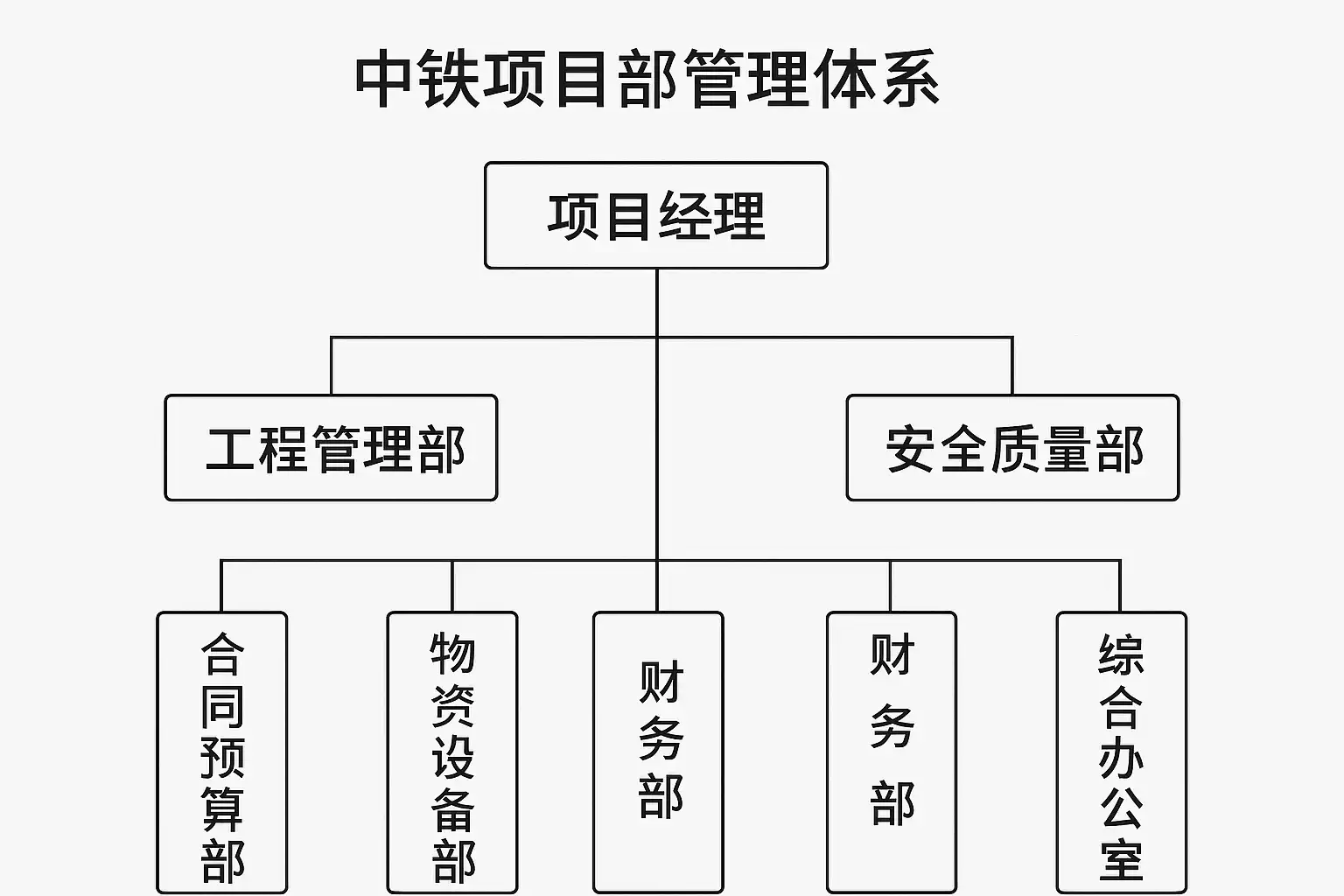 项目部的组织架构设计 中铁项目部通常采用矩阵式结构,设有项目经理、总工程师、技术负责人、安质负责人、商务负责人等核心岗位,下设技术、安质、商务、物资、财务等职能部门。每个部门均有明确的岗位职责分工,确保管理体系的高效运转。