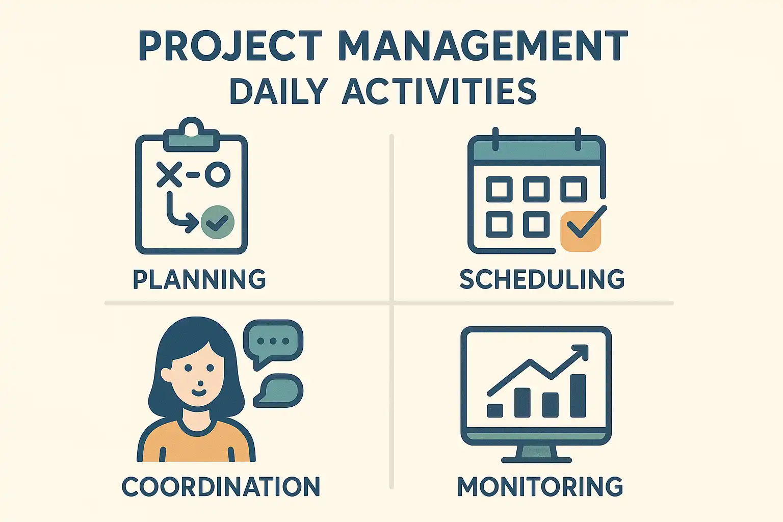 项目经理每天要依据项目阶段和实际进展,灵活安排这些工作内容,确保项目按既定目标顺利推进。