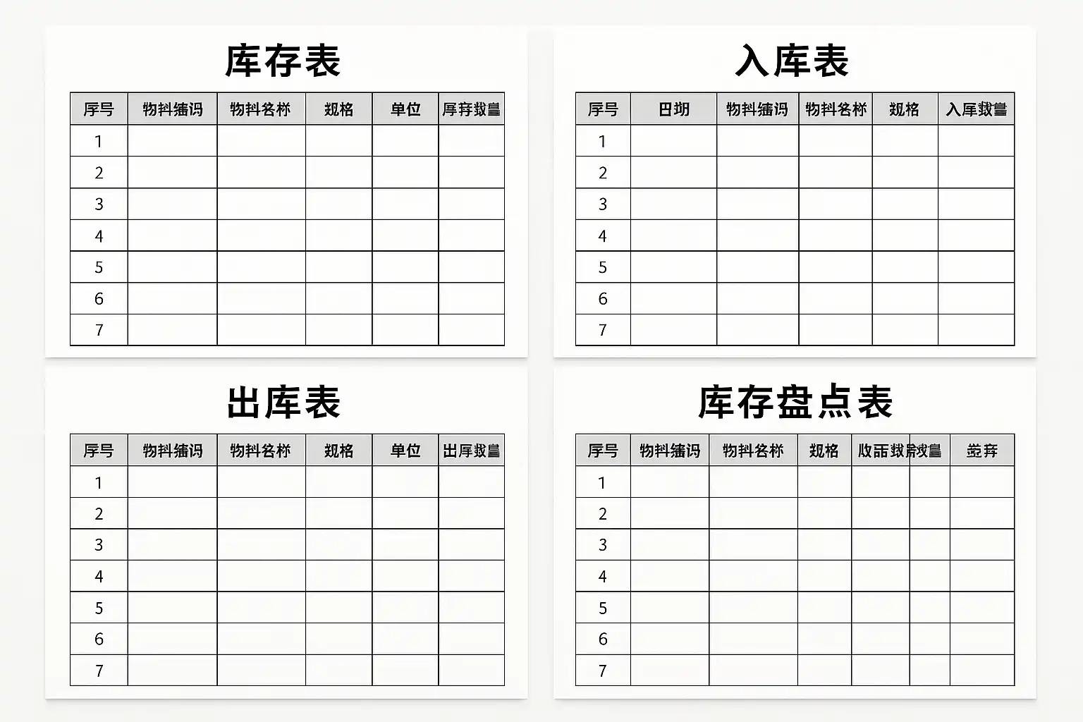 - 库存盘点表:用于定期核对库存数量,确保账实相符。
