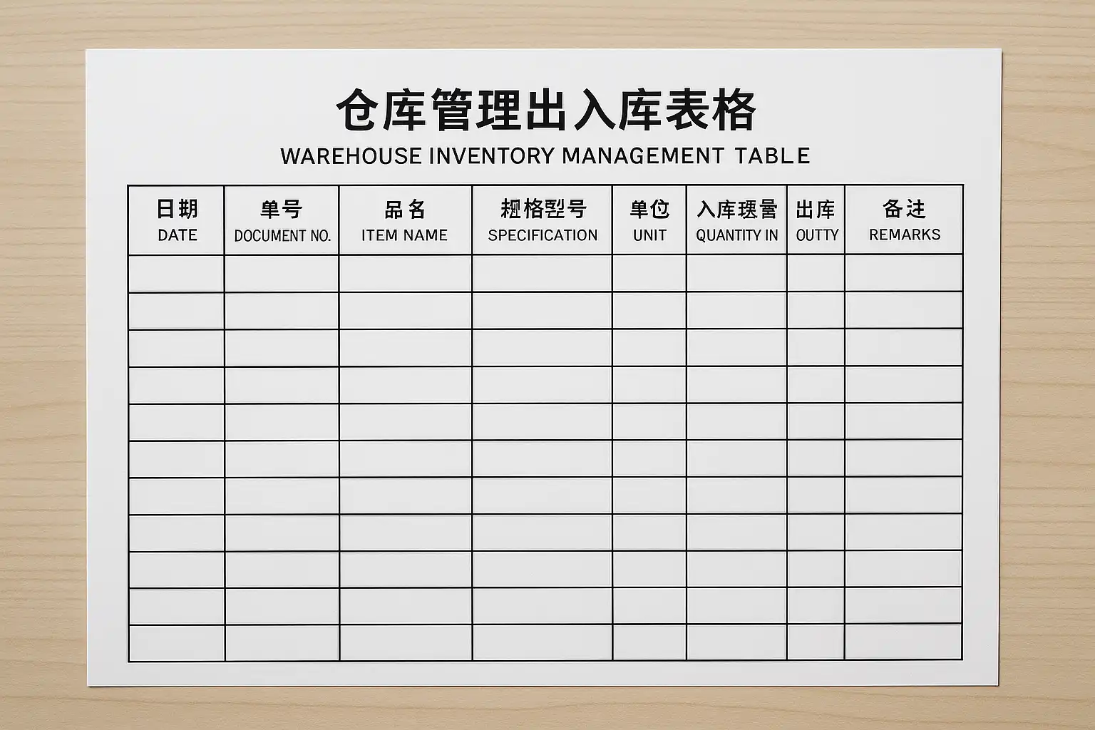 - 明确核心字段:包括日期、物品名称、规格型号、数量、入库/出库类型、经手人等。