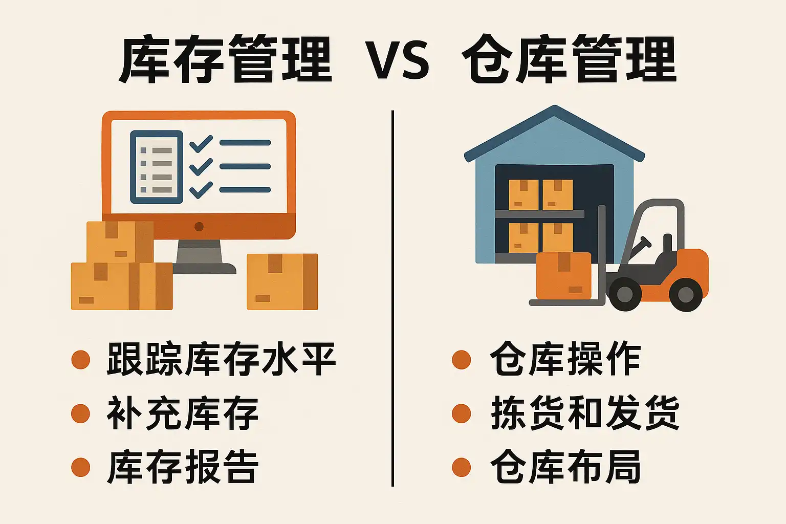 我在工作中经常听到库存管理和仓库管理,但它们的日常操作具体有什么不同?我想知道具体流程上的区别。