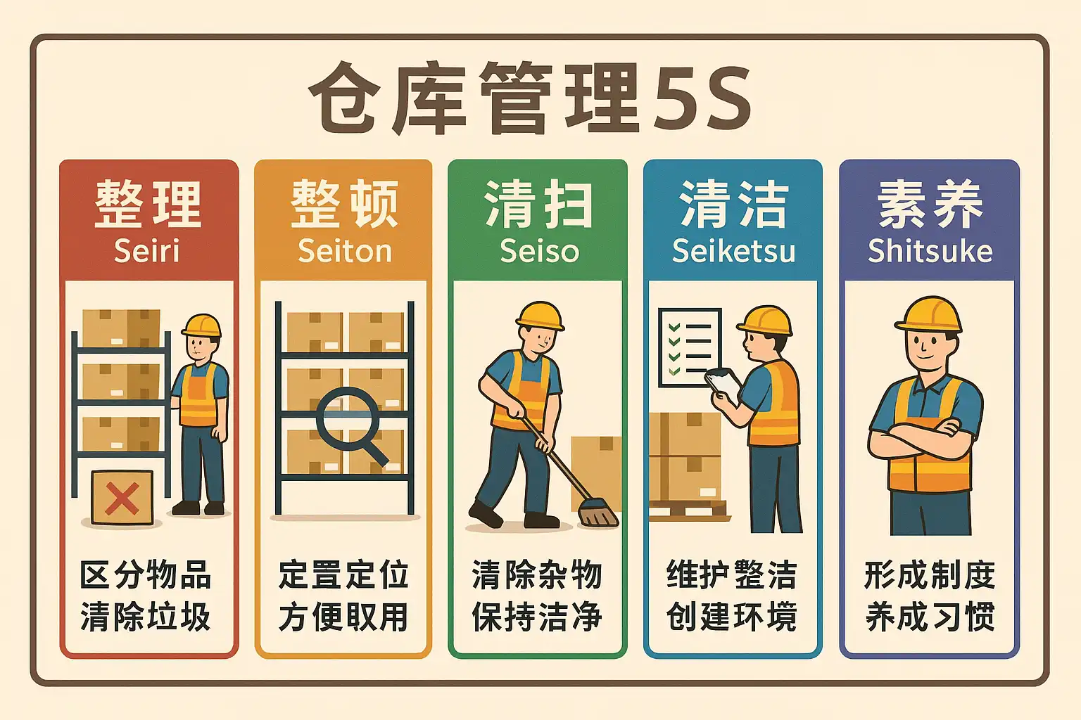 5S管理源自日本,是精益生产和现代仓储管理的基础。5S分别代表: