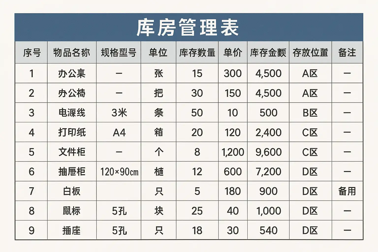 | 库存盘点 | 盘点日期、物品编号、库存数量、差异说明等 |