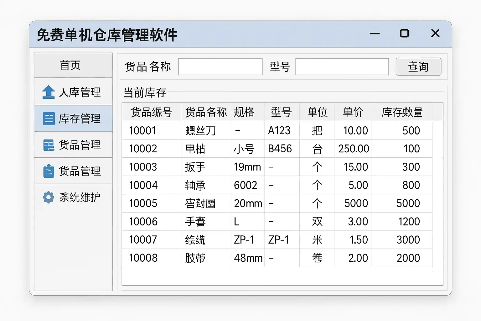 | 4 | 基本功能满足日常管理 | 通常支持入库、出库、库存查询、盘点等仓库基础操作。 |