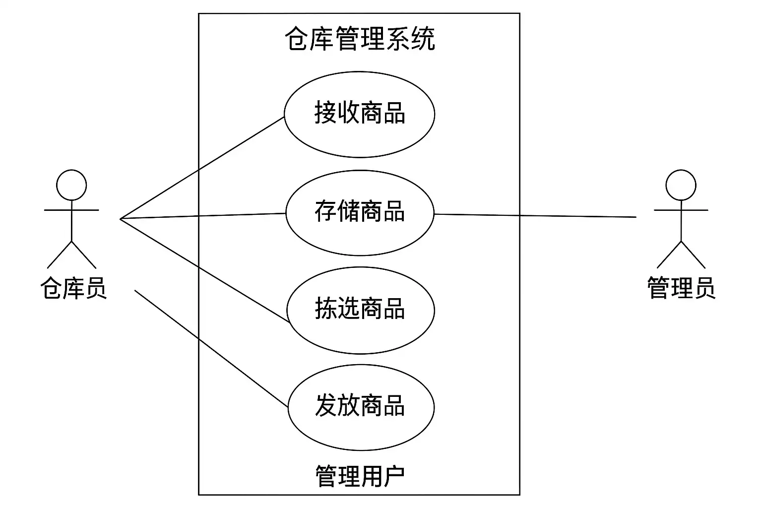 例如,“出库管理”用例由仓库管理员和系统管理员共同操作,两个参与者均与该用例关联,清晰展现协作关系。