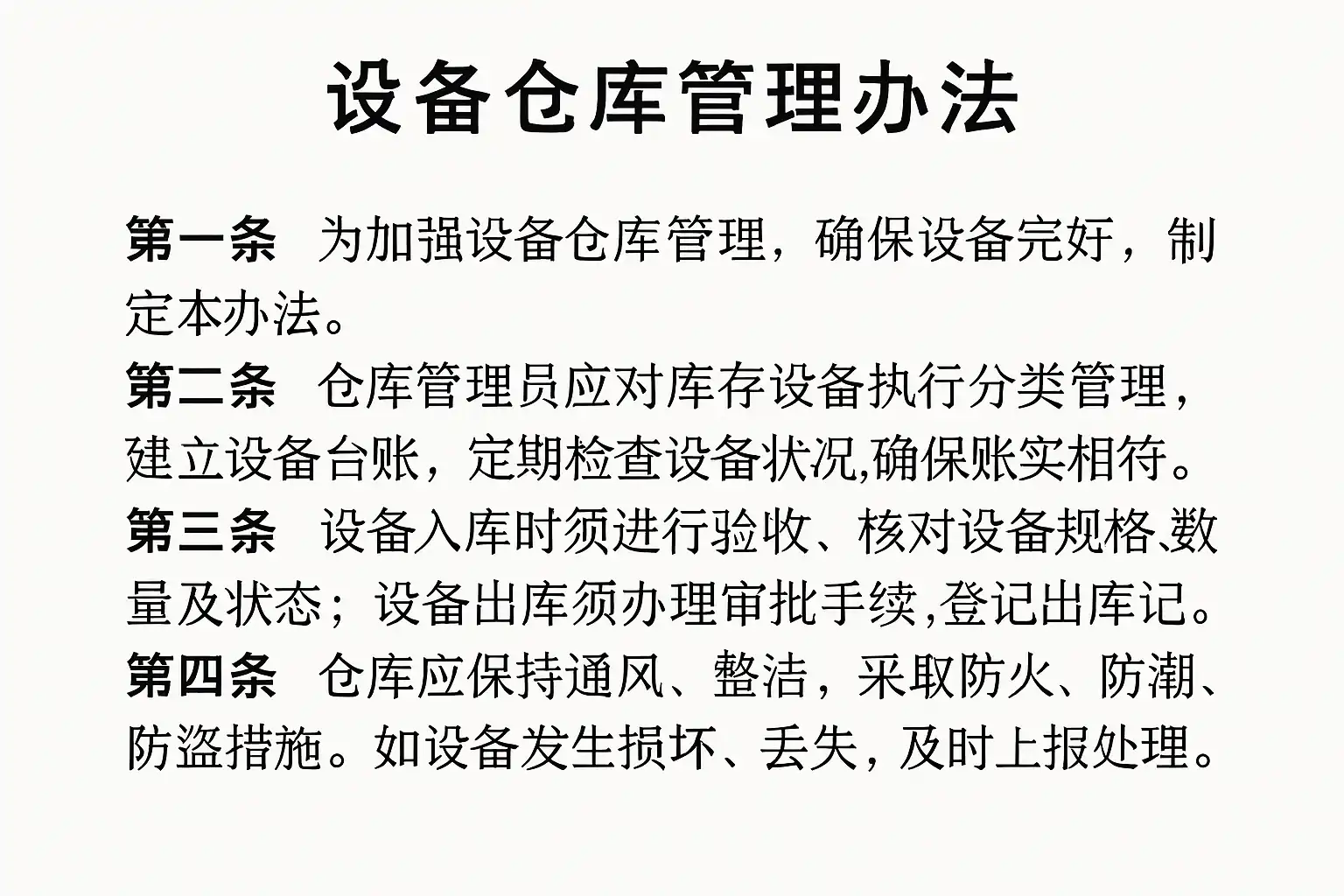 | 设备入库 | 验收、登记、标识、分类存放 | 严格核查、编码管理、台账建立 |